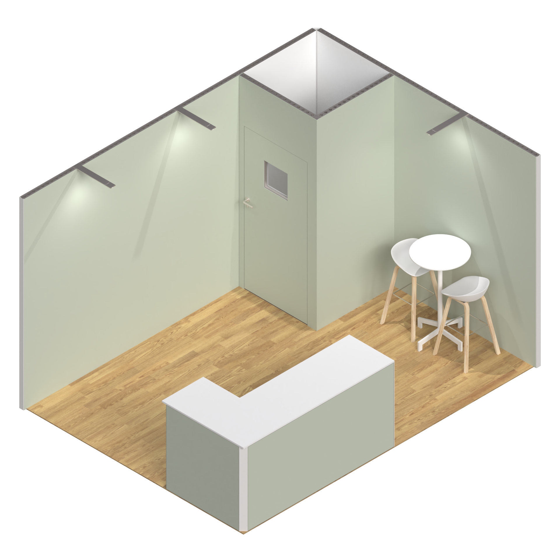 A compact 3x2m stand with a 2.5m canopy and open layout. The screen and counter make it ideal for demos or quick product overviews, while the shelves add space for lightweight displays or samples. Perfect for small spaces that need big impact.